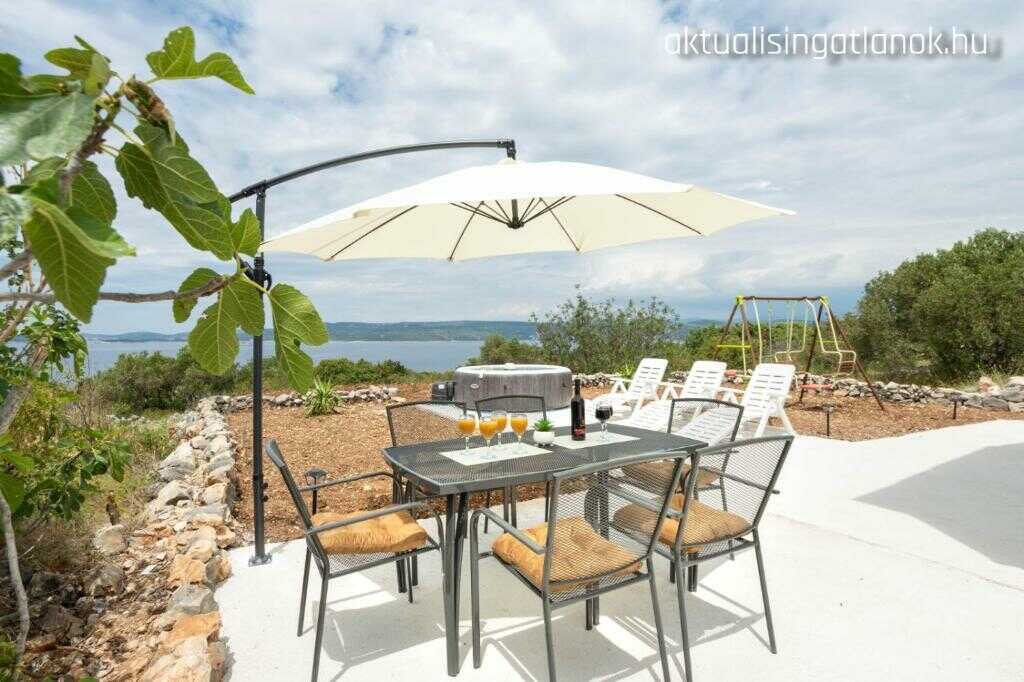 Zadarska, Sveti Filip I Jakov, Turanj, Babac szigeten, 2023-ban épült ház, első sor a tengertől, 500 m2-es teleken és 110 m2-es ház plusz előtető. A ház helységei: 3 szoba, nappali-étkező-konyha, fürdőszoba, + 1 wc mosdóval. nagy terasz, közvilágítás a szigeten, BABAC SZIGET, 700 MÉTERRE TURANJTÓL